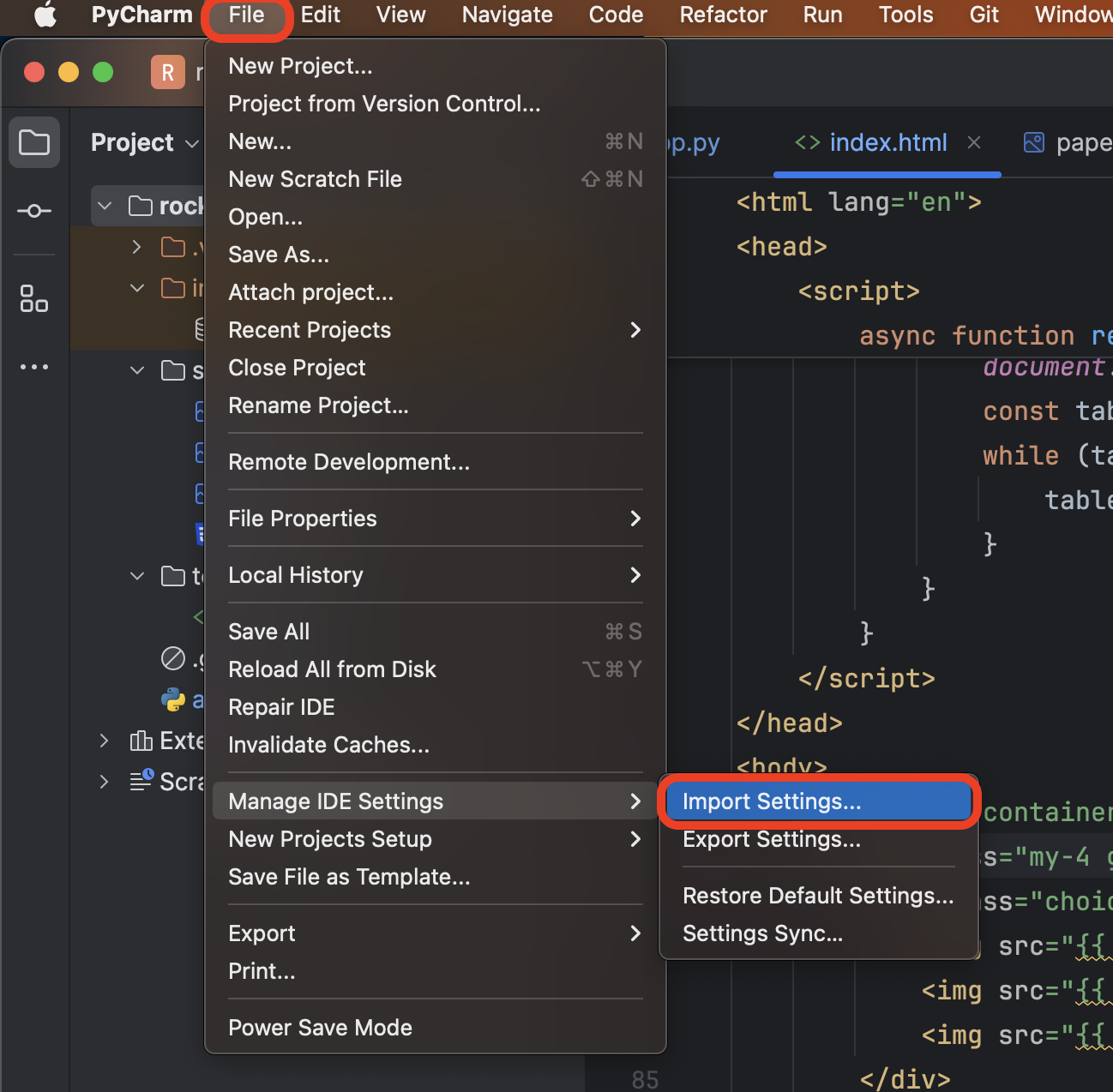 2. 파이참 > file > Manage IDE Settings > Import Settings... 클릭