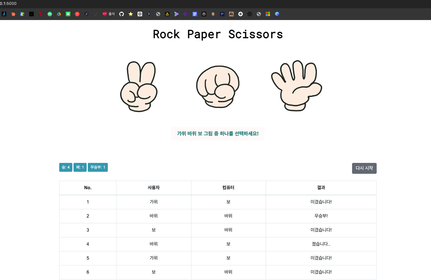@app.route('/play', methods=['POST']) def play(): initialize_session() player_choice = request.json.get('choice') computer_choice = get_computer_choice() result = determine_winner(player_choice, computer_choice) # 데이터베이스에 결과 저장 new_game = GameHistory(player_choice=player_choice, computer_choice=computer_choice, result=result) db.session.add(new_game) db.session.commit() # 결과와 승, 패, 무승부 횟수 반환 return jsonify({ 'player_choice': player_choice, 'computer_choice': computer_choice, 'result': result, 'win': session['win'], 'lose': session['lose'], 'draw': session['draw'] })@app.route('/reset', methods=['POST'])