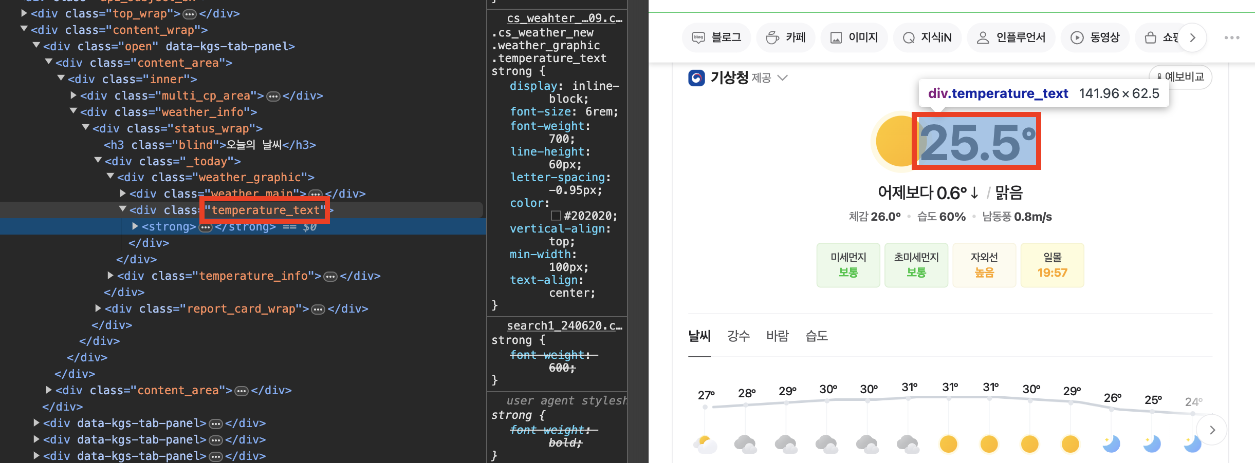 숫자만 가져와야 하니까, 다시 html 태그 들어가서 살펴보면 temperature_text 안에 strong 태그가 있다.