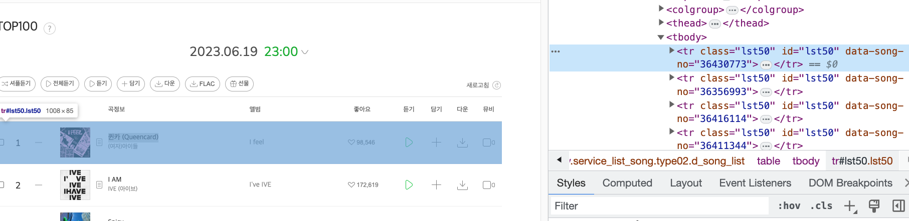 확인해보면, lst50이라는 tr태그 안에 클래스 이름, 아이디 이름이 포함되어 있음