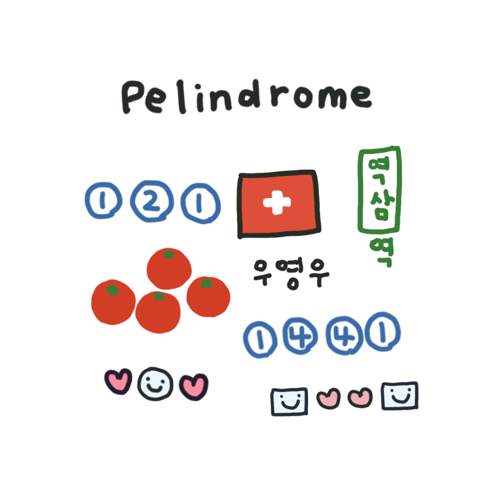 펠린드롬이란 우영우, 스위스, 기러기, 토마토, eye, hannah, 121, 1441 처럼, 앞에서 읽든 뒤에서 읽든 똑같은 걸 말한다.