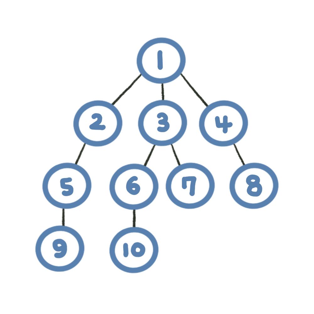 graph = { 1: [2, 3, 4], 2: [5], 3: [6, 7], 4: [8], 5: [9], 6: [10], 7: [], 8: [], 9: [], 10: [], }