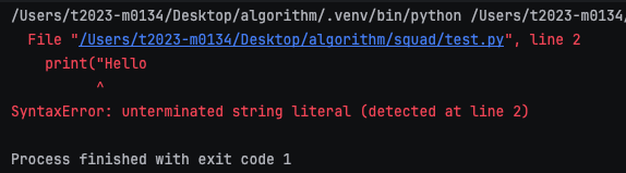 def greet(name): print("Hello이렇게 SyntaxError와 에러가 감지된 줄의 가장 앞의 위치를 가리키고 있는 캐럿기호 ^ 을 확인할 수 있다.