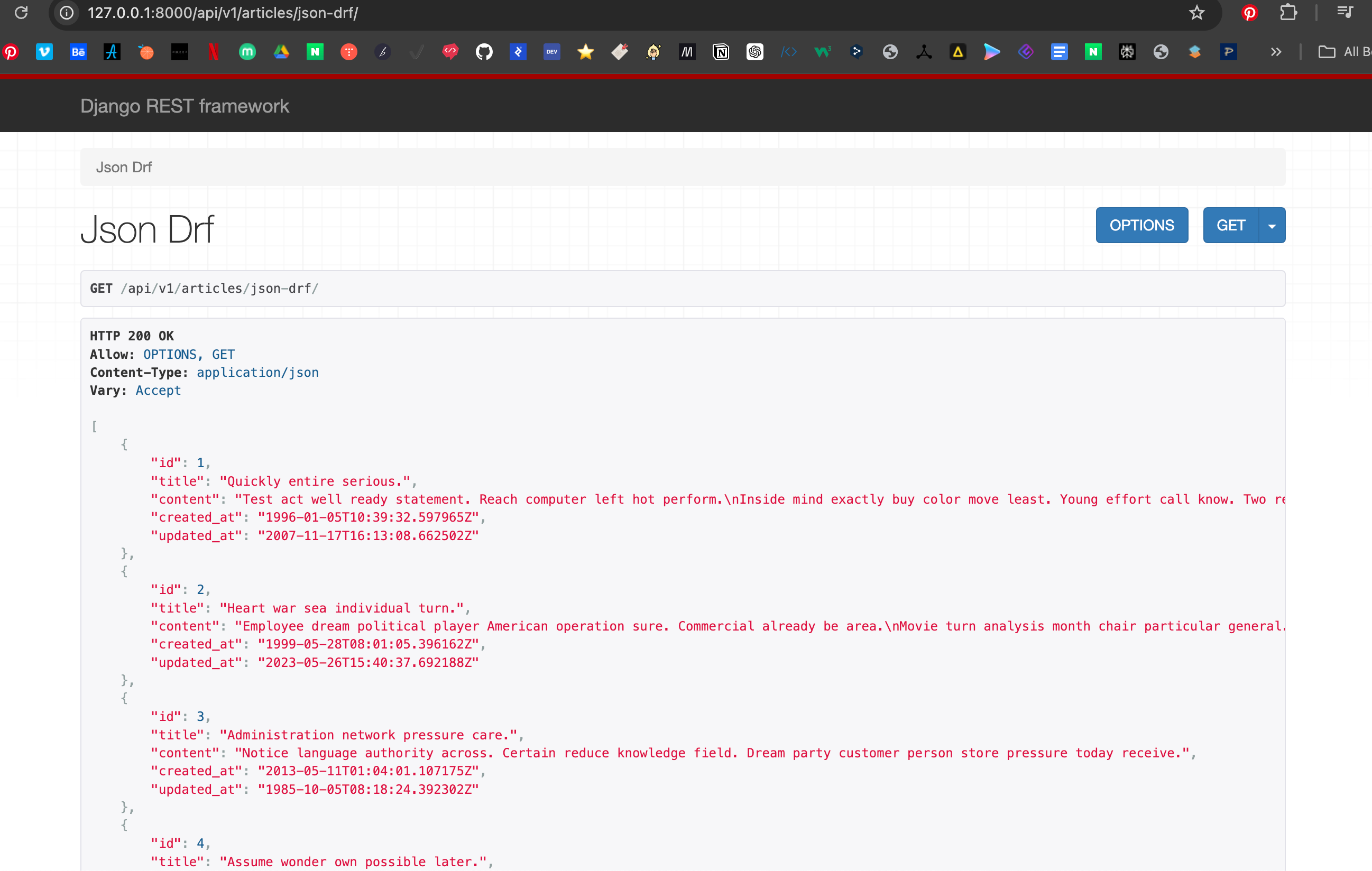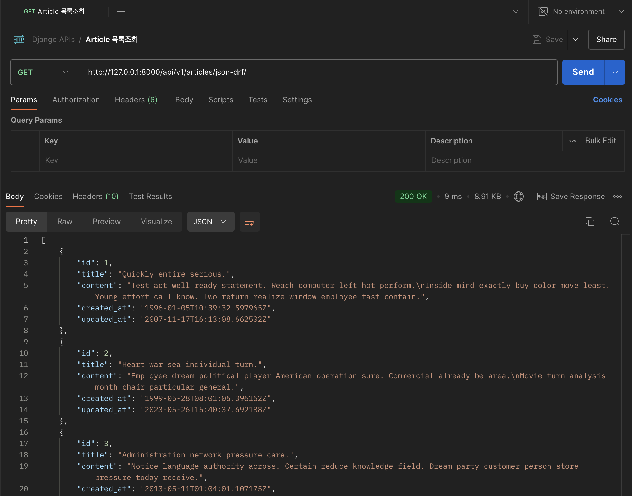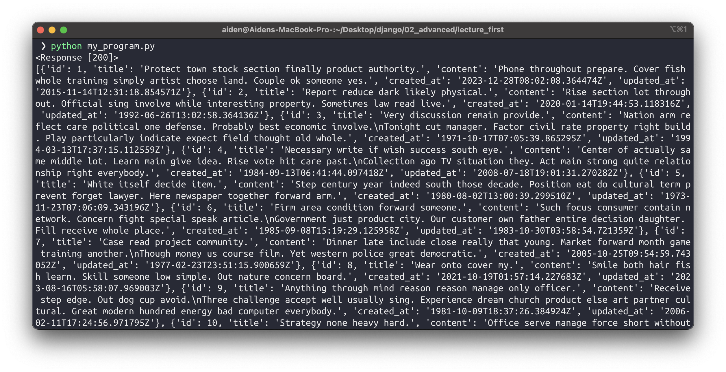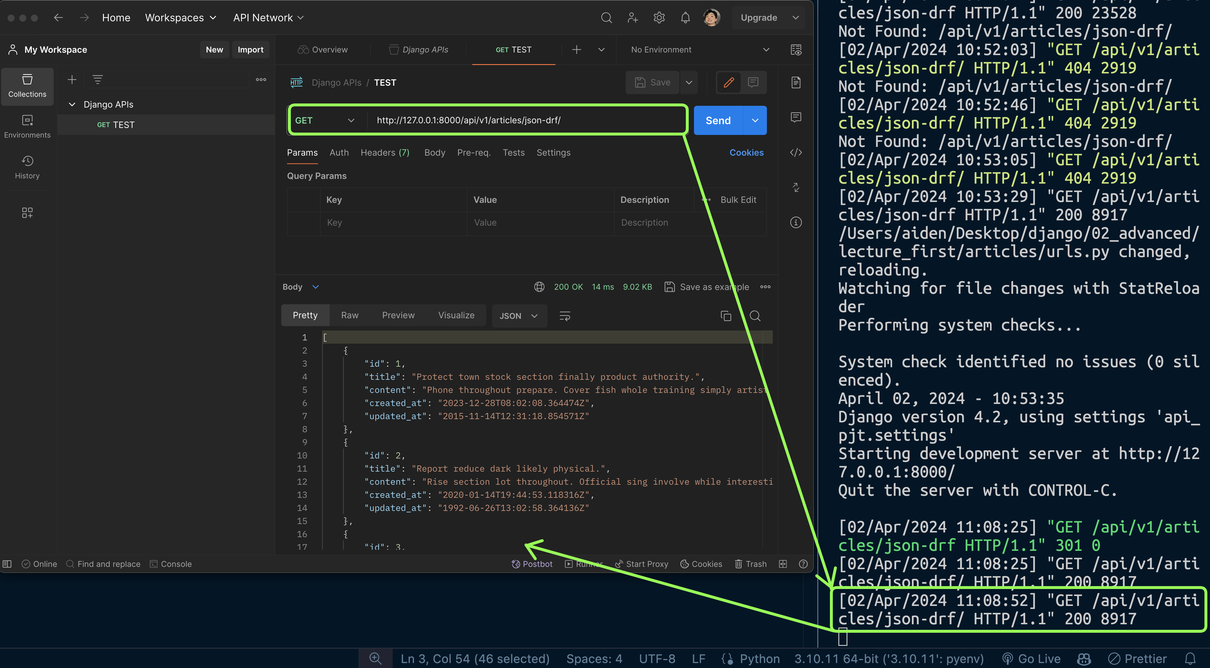import requests url = "http://127.0.0.1:8000/api/v1/articles/json-drf" response = requests.get(url) print(response) print(response.json())프린트 해보면 데이터가 잘 나온다. 이제 이 데이터를 사용해서 보여주는 건 Client의 몫이다.