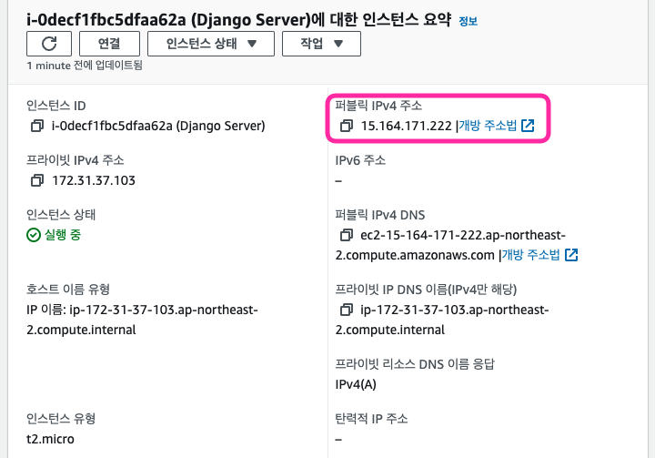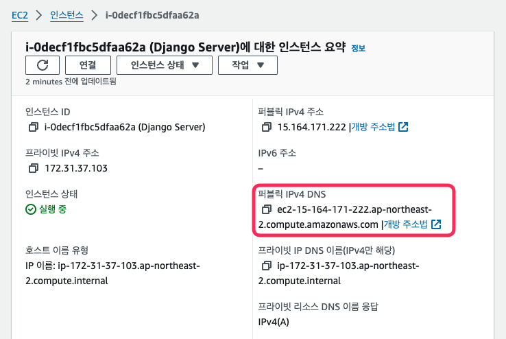 - 그리고, 퍼블릭 DNS 주소는 AWS 서버에서 복사해오면 된다.