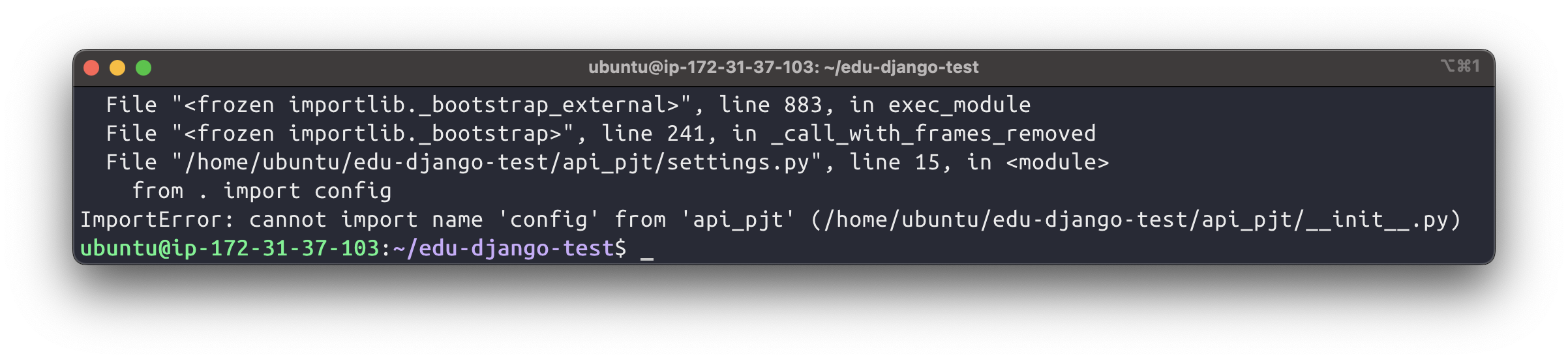 에러메시지를 보면, apt_pjt에서 config를 import할 수 없다고 하는데 당연하다. config를 .gitignore에 숨겼기 때문이다.