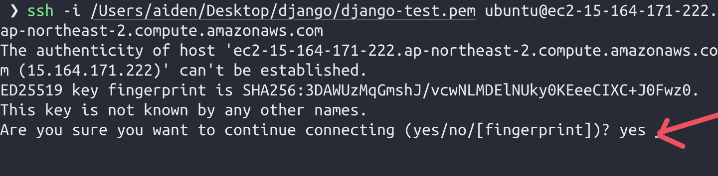 ssh -i ~~/~~.pem ubuntu@ec2~~~~~.amazonaws.com최초 연결시 yes 입력 후 진행