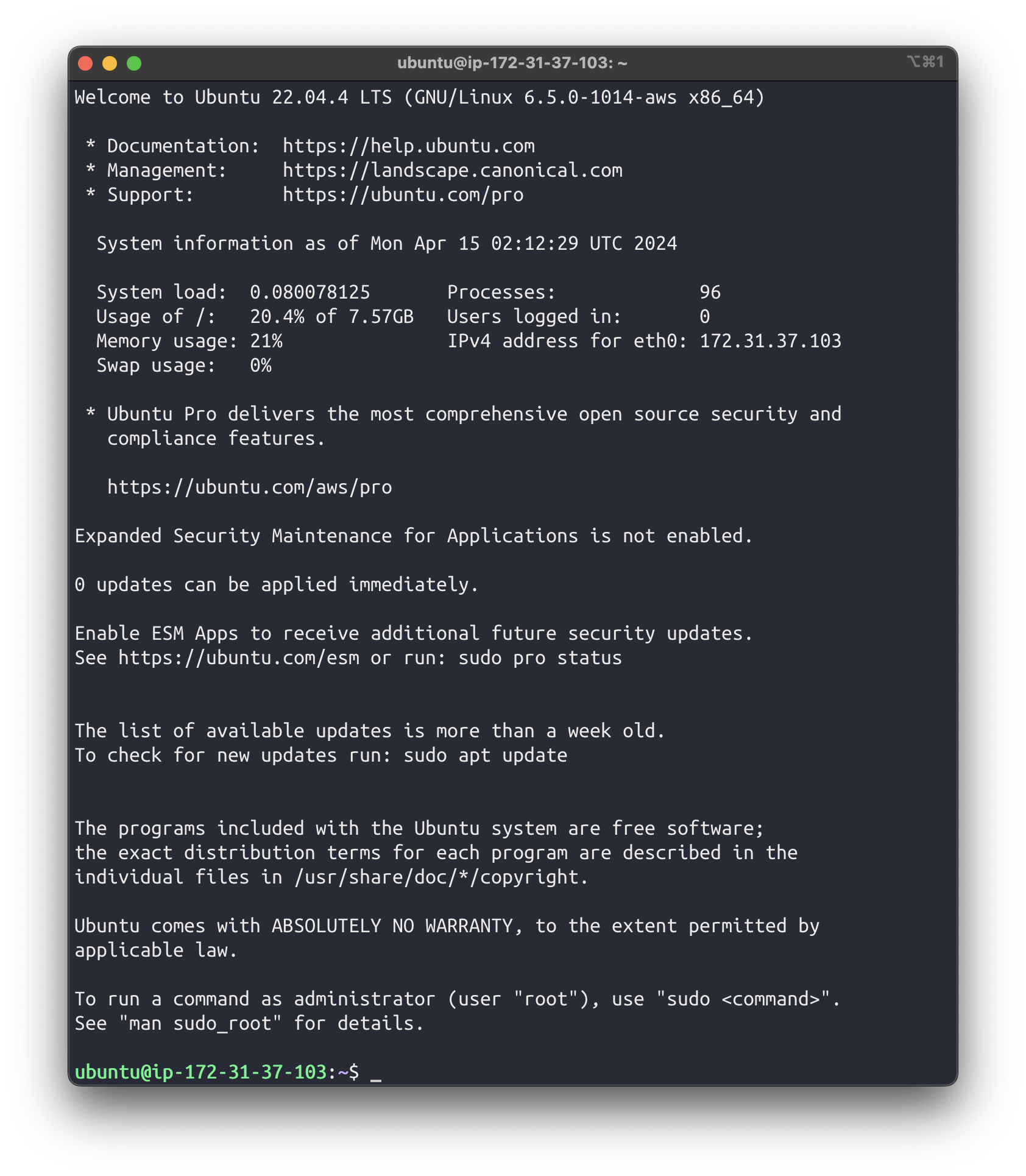 chmod 400 {.pem 키페어 파일 경로}터미널에서 이렇게 보이면 AWS에서 임대한 EC2 인스턴스에 잘 접속된거다👍