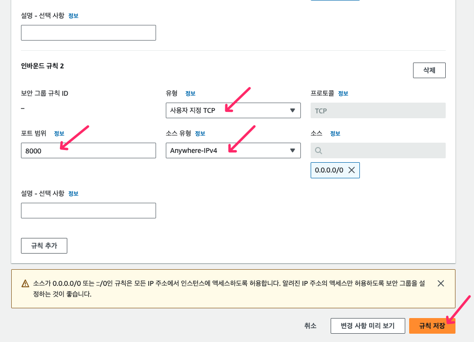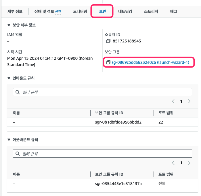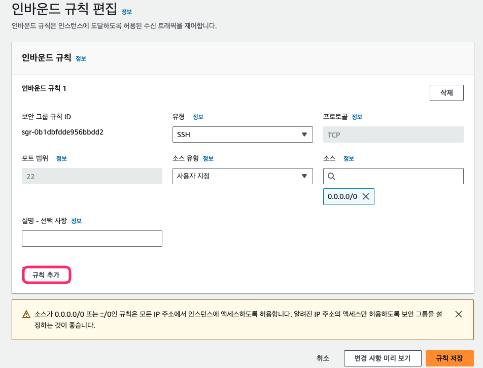 - 인바운드: EC2 인스턴스로 들어오는 규칙