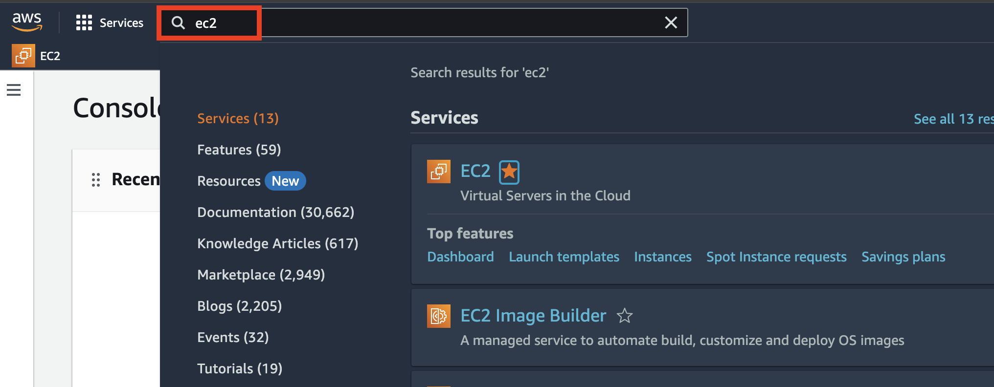 검색에 ec2 적고 ★ 즐겨찾기! (가운데 빈 별을 누르면 이렇게 가득찬 별이 되고 즐겨찾기 된다)