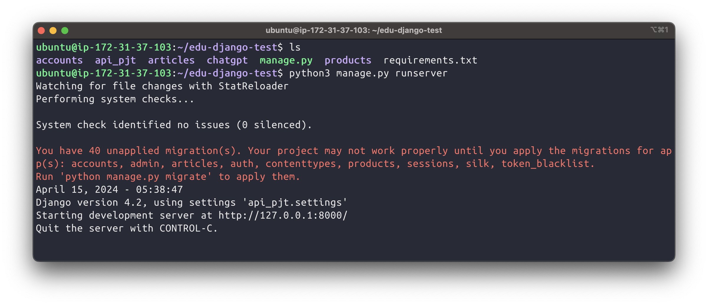 python3 manage.py migrate★★ makemigrations 명령은 배포 인스턴스에서 하지 않는다. 필요할 경우 로컬에서 모두 작업해서 migration 파일을 생성한 뒤, 해당 변경 사항을 받아와서 적용해야 한다.