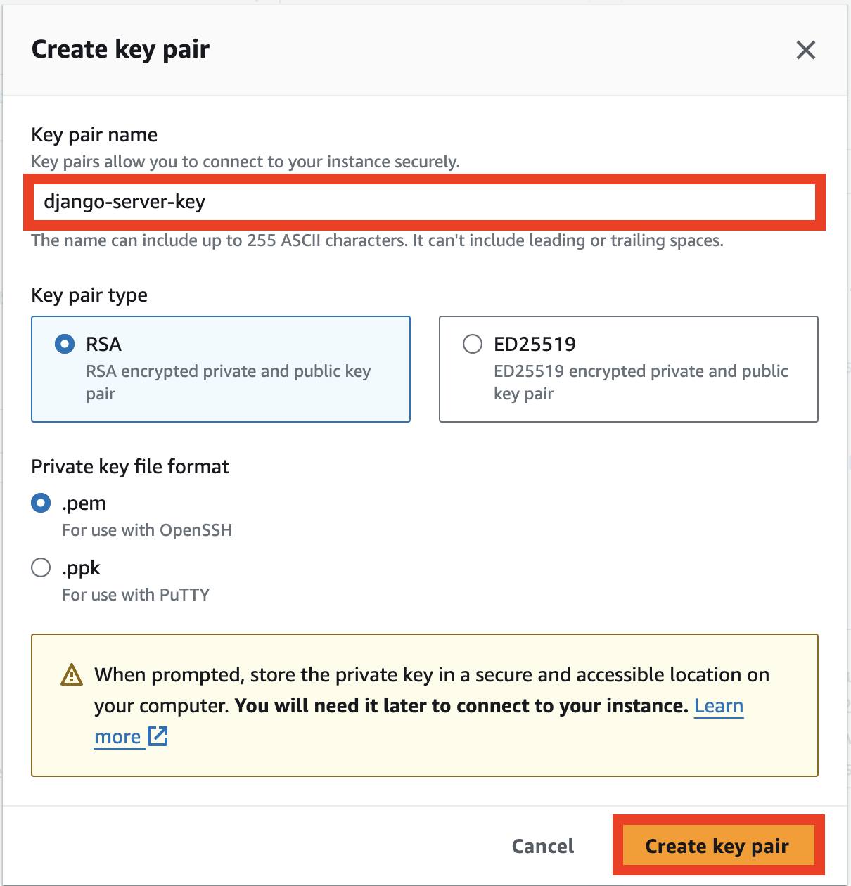 📌 키페어 는 내 EC2 인스턴스에 접근할 수 있는 일종의 암호키이다. 키페어를 공유하거나 잃어버리지 않도록 주의해야 한다.