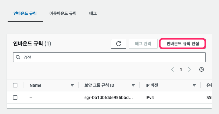 - EC2 인스턴스 아래의 보안 → 보안 그룹 → 인바운드 규칙 편집