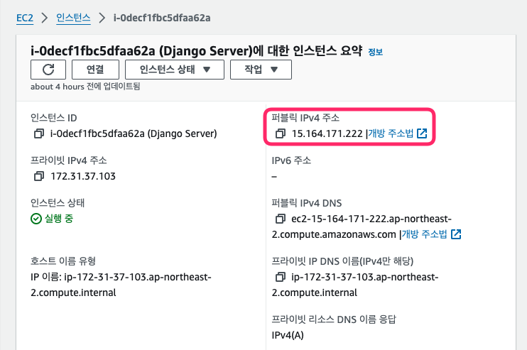 각자의 AWS 인스턴스 퍼블릭 IPv4 주소 복사해서 :8000 붙여서 연결해보면