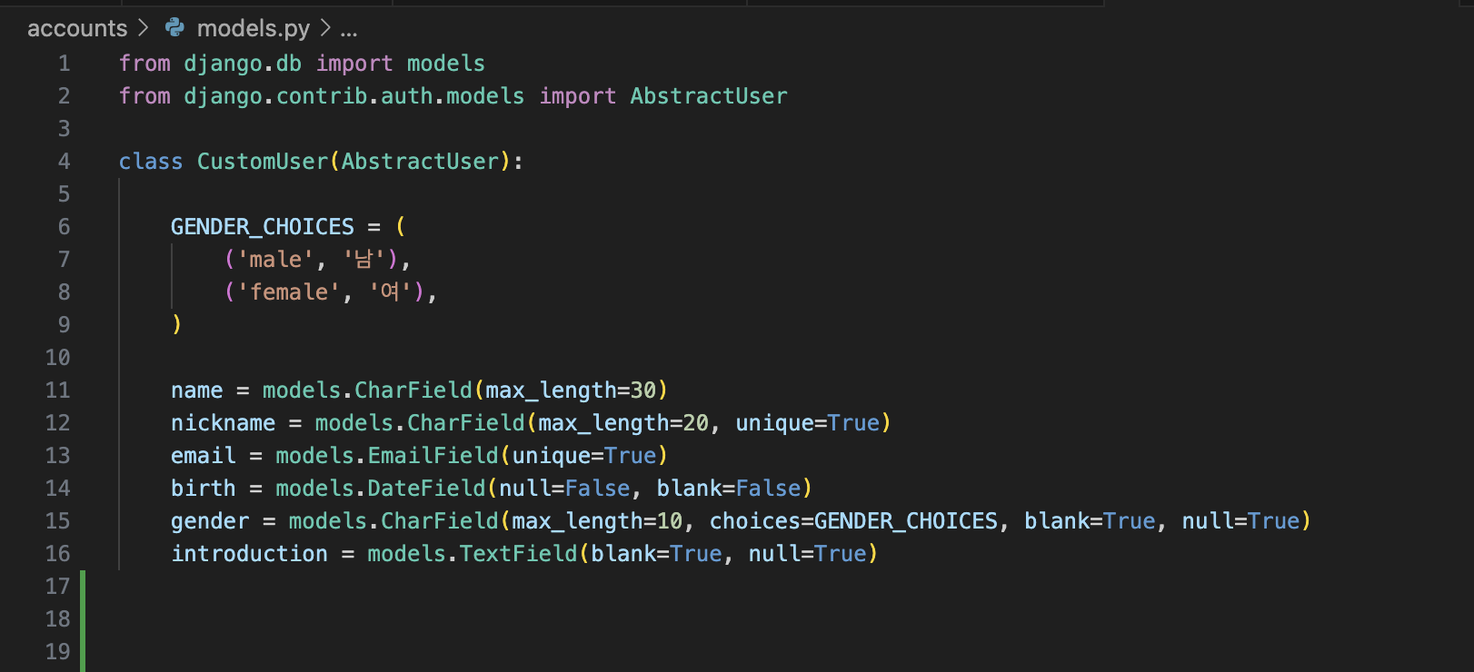 그래서 다시, 유저가 성별을 선택할 수 있도록 GENDER_CHOICES 를 추가했다.