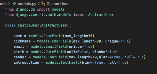 회원가입 시, 처음 성별 필드에 조건에 아무것도 주지 않았다. max_length=10로 최대 글자수, blank=True null=True 로 빈 값으로 둘 수 있게만 해두었다.