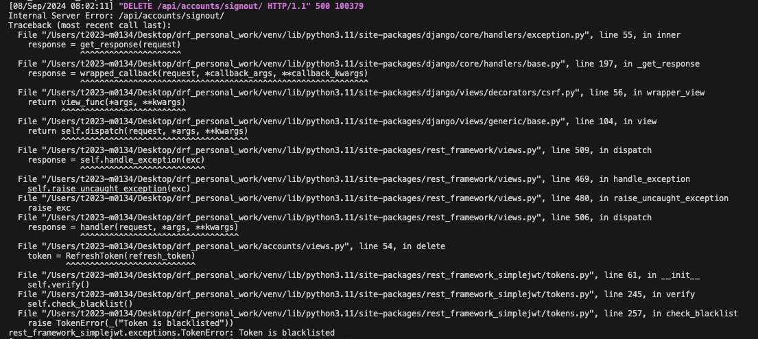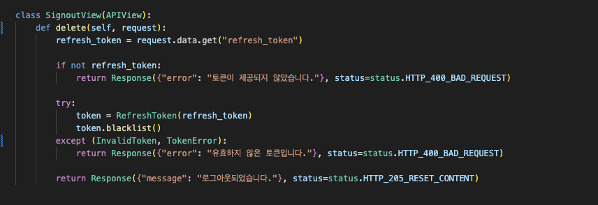 하지만 간결하게 코드를 작성하고 싶어서 또다시 구글링 하다보니 TokenError가 InvalidToken을 포함하는 범용적인 에러이기 때문에 TokenError만을 사용하여 예외를 처리하는 것이 좋다고 한다. 정말 그런지 튜터님께 여쭤봐야겠다.