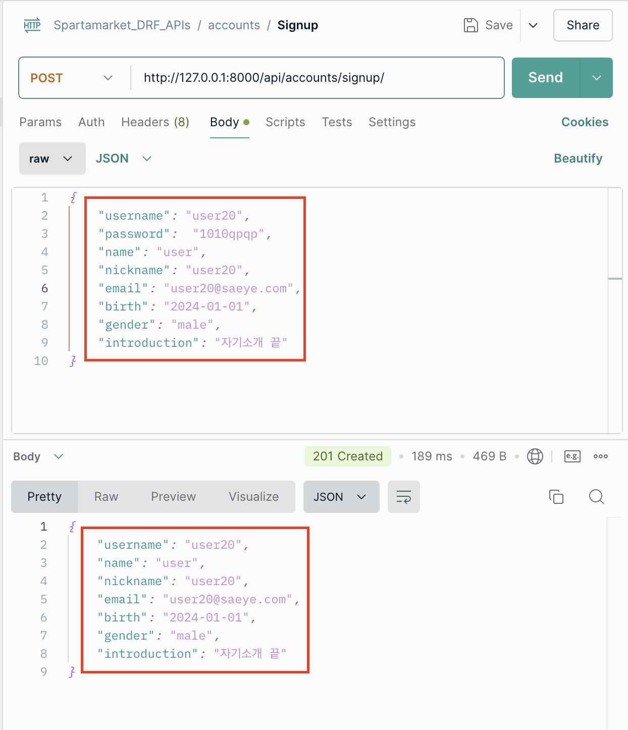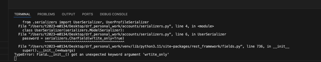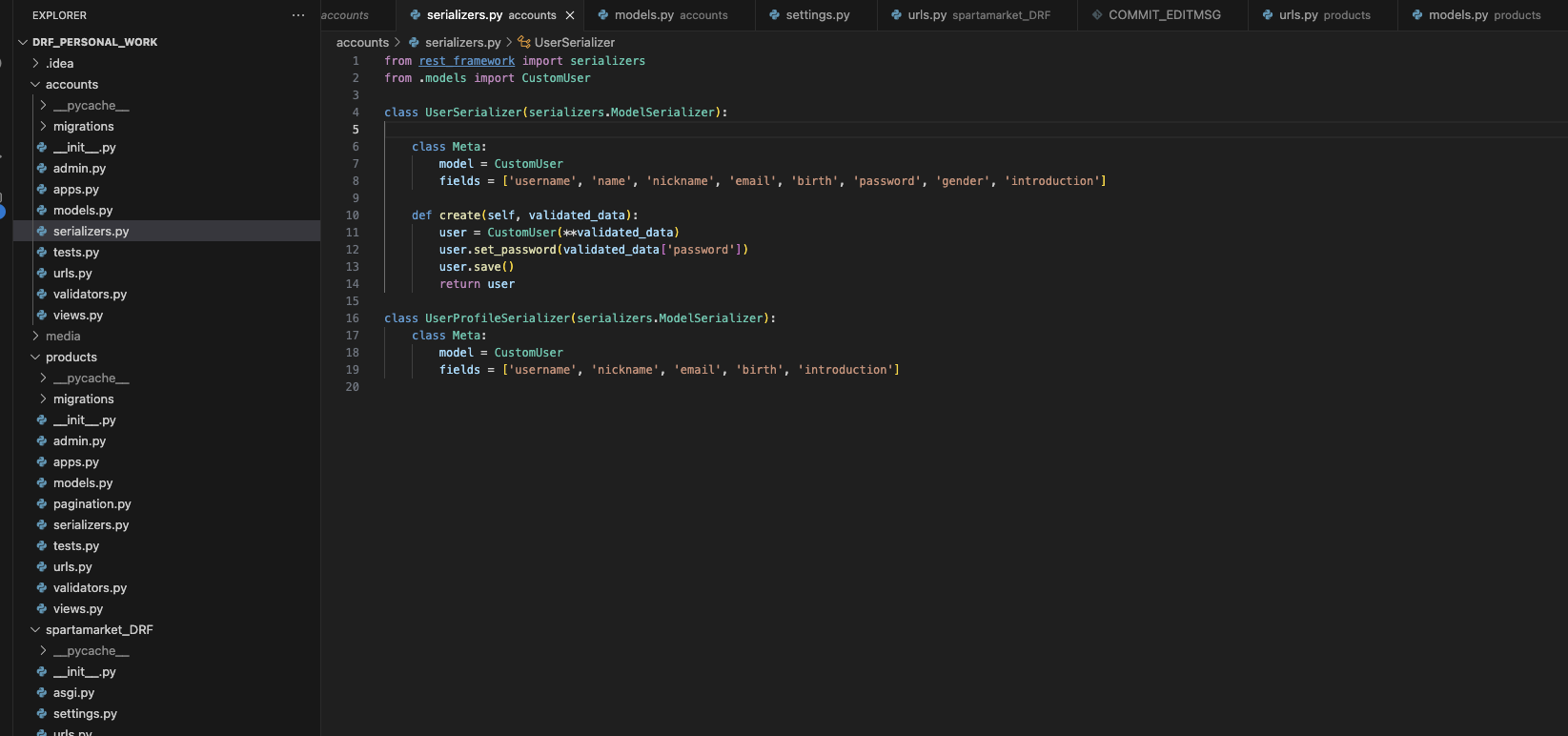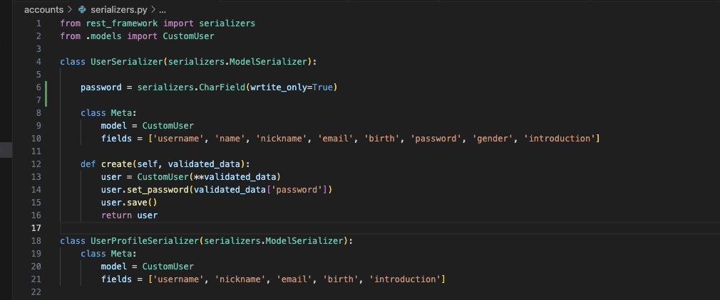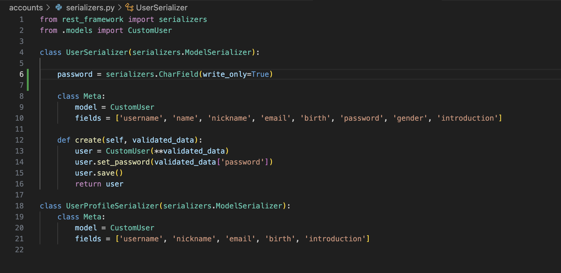 from rest_framework import serializers from .models import CustomUser class UserSerializer(serializers.ModelSerializer): password = serializers.CharField(write_only=True) class Meta: model = CustomUser fields = ['username', 'name', 'nickname', 'email', 'birth', 'password', 'gender', 'introduction'] def create(self, validated_data): user = CustomUser(**validated_data) user.set_password(validated_data['password']) user.save() return user class UserProfileSerializer(serializers.ModelSerializer): class Meta: model = CustomUser fields = ['username', 'nickname', 'email', 'birth', 'introduction']처음부터 코드를 잘 구현해야 하겠지만, 테스트하면서 이상한 점을 발견하고 계속해서 코드를 수정보완 할 수 있어서 다행이라는 생각이 들었다. 그러다 코드가 산으로가도 온전히 내 책임이긴 하지만.. 또 나뿐만 아니라 오타로 인한 에러가 생각보다 꽤 많은 것 같다. 그리고 그러한 에러는 내가 오타를 썼을거라고는 전혀 생각하지 않고 있기 때문에 해결하는데 꽤나 오랜 시간이 걸린다🤔