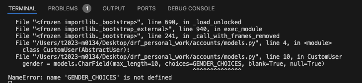 NameError: name 'GENDER_CHOICES' is not defined 에러는 GENDER_CHOICES가 gender 필드가 정의된 시점보다 먼저 정의되지 않았기 때문에 생긴 문제였다.