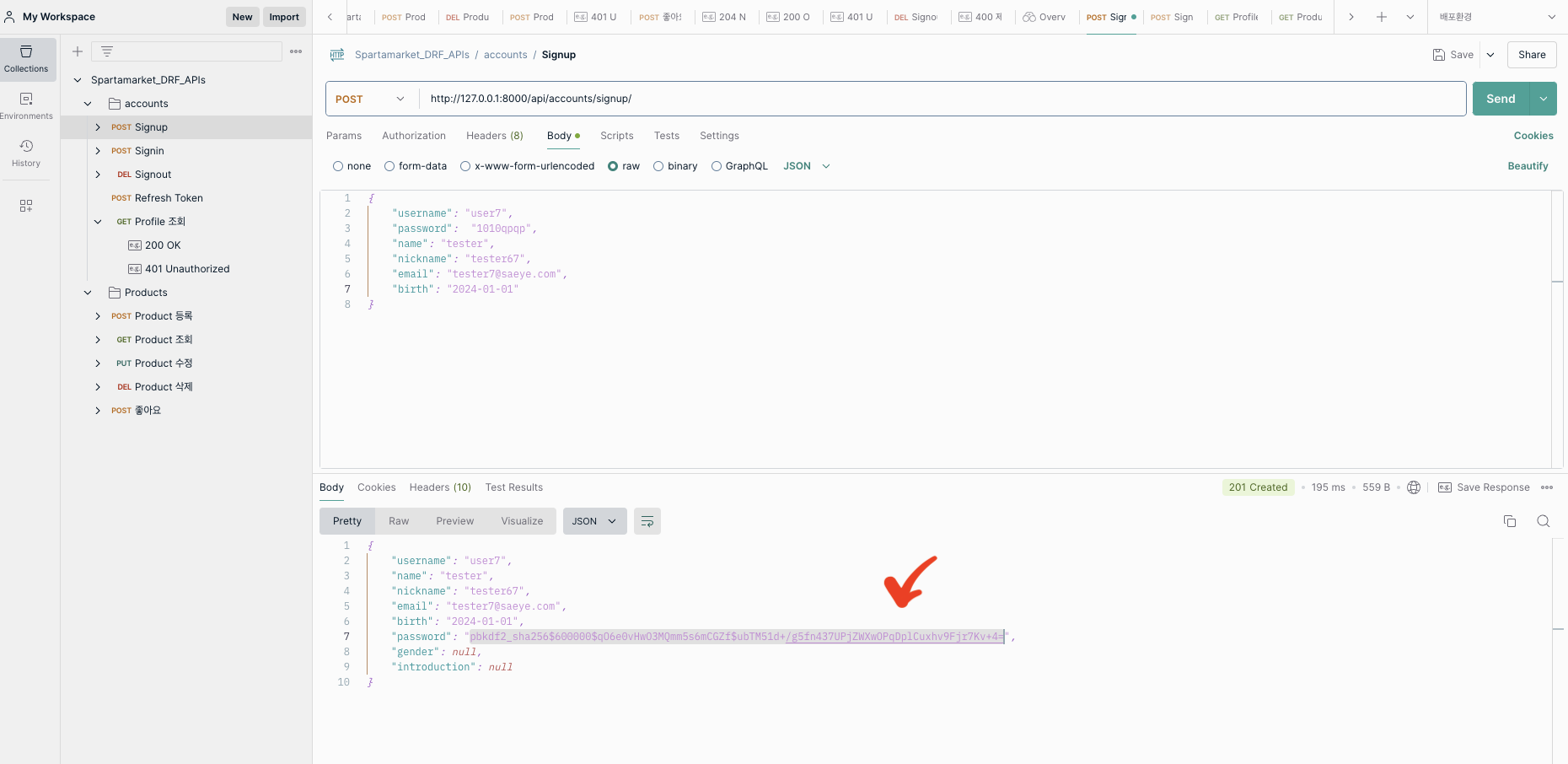 근데 회원가입 했을 때 해싱된 비밀번호가 보이면 안되지 않나.. 근데 내 포스트맨은.. 테스트 해보니 Respond에 이렇게 유저 비밀번호가 보인다.. 🤔