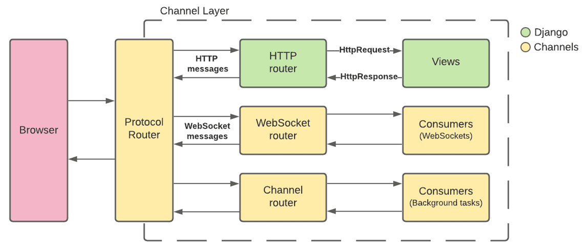 채팅방으로 예시를 들면, 클라이언트가 채팅방 주소에 요청을 보내며 채널 레이어에서 적절한 프로토콜을 선택하고 > 선택된 프로토콜을 통해 클라이언트와 서버가 연결되면, 채널 라우터에서 적절한 채널의 consumer와 연결한다.